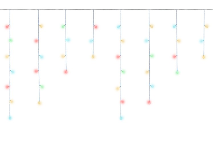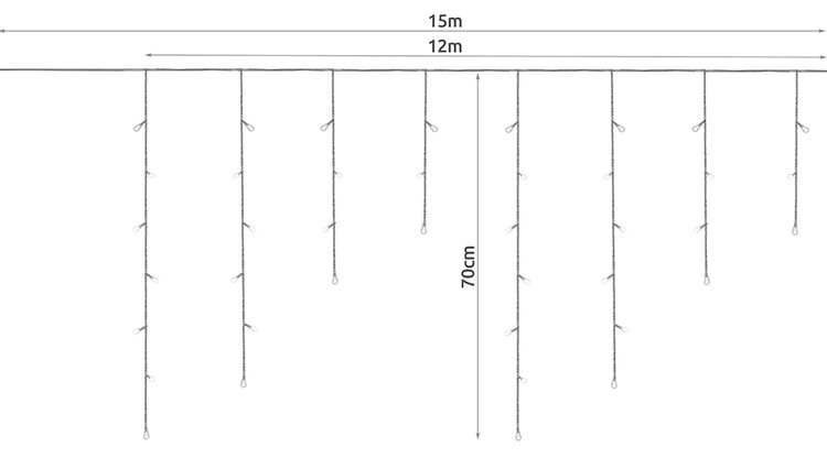 - SPECYFIKACJA – ilość trybów: 8; rodzaj oświetlenia; LED; sterownik: tak; barwa światła: multicolor; ilość diod LED: 300; klasa wodoodporności: IP44; zasilanie: sieć energetyczna; moc: 2,48W; napięcie: 230V / 31V; ilość sopli: 60; długość całkowita: 15m; waga: 0,46kg; waga w opakowaniu: 0,5kg.