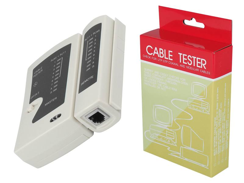 Tester kabli komputerowych typu UTP i FTP zakończonych wtykami RJ-45. Gwarantuje precyzyjny i dokładny odczyt, który pomoże ocenić stan naszej sieci i jeśli zajdzie taka potrzeba zdiagnozować usterkę, Każdy instalator dbający o prawidłowość działania wykonywanych przez siebie sieci powinien wyposażyć się w to urządzenie.