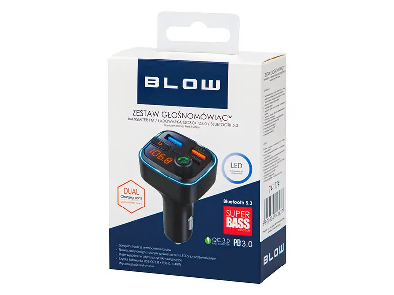 Urządzenie przesyła muzykę i rozmowy telefoniczne bezpośrednio za pomocą łączności bluetooth do samochodowego systemu stereo FM. Produkt posiada wysokiej jakości mikrofon (wykorzystywany w funkcji zestawu głośnomówiącego), a także porty USB, które pozwalają zarówno na odtwarzanie plików muzycznych poprzez system stereo samochodu jak i ładowanie telefonu w tym samym czasie. Dzięki unikalnej funkcji BASS BOOST urządzenie zapewnia znacznie głębsze basy (funkcja aktywowana odpowiednim przyciskiem podczas odtwarzania muzyki). Przed użyciem należy przeczytać uważnie instrukcję obsługi.